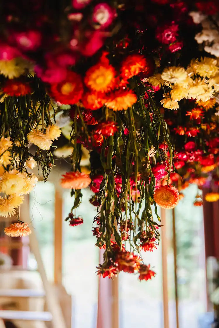 Une fois cueillies à la main, au moment parfait de leur floraison, nos fleurs rejoignent l'obscurité de notre séchoir pour un lent processus de déshydratation, tête en bas.