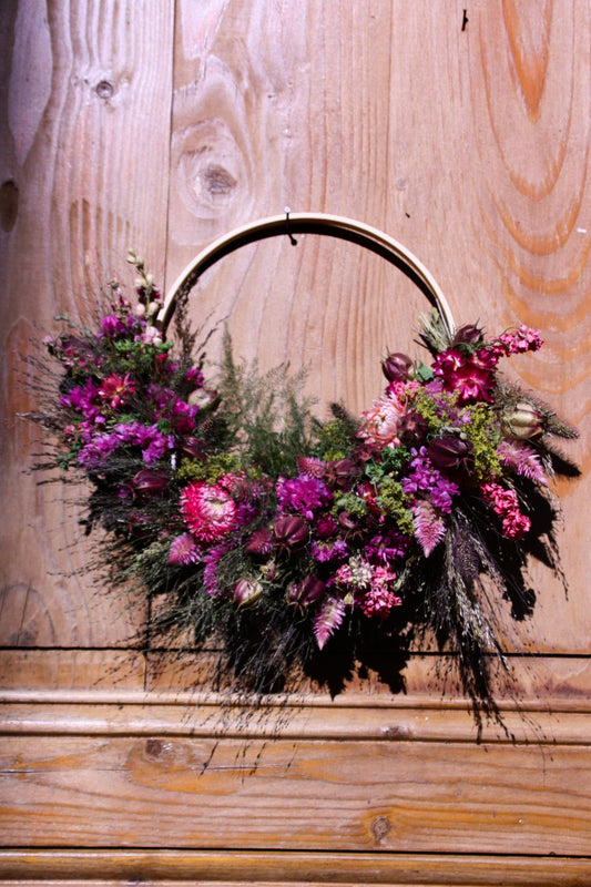 Chaque couronne de fleurs séchées des Fleurs de la Clarté est composé par nos soins dans notre atelier à la ferme.